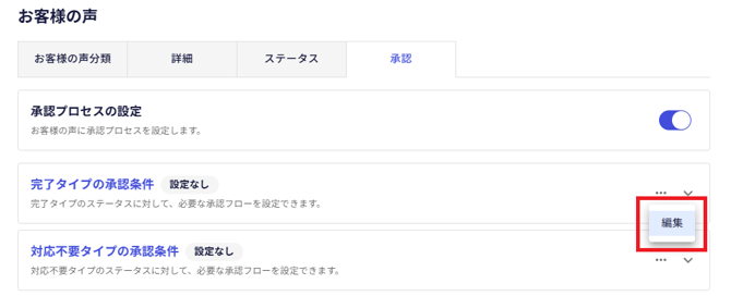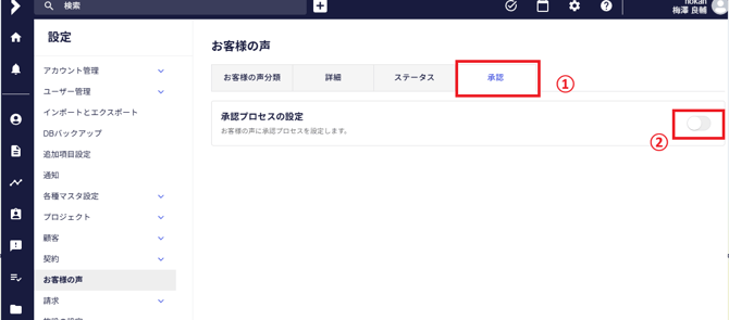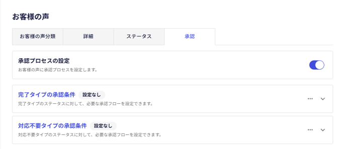「すべてのお客様の声に対して承認が必要」か、「特定のお客様の声に対しての承認が必要」の設定が可能です。