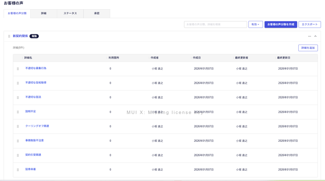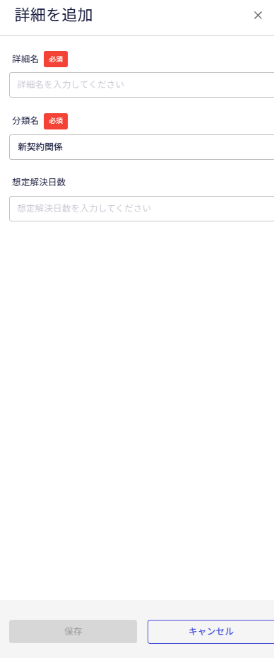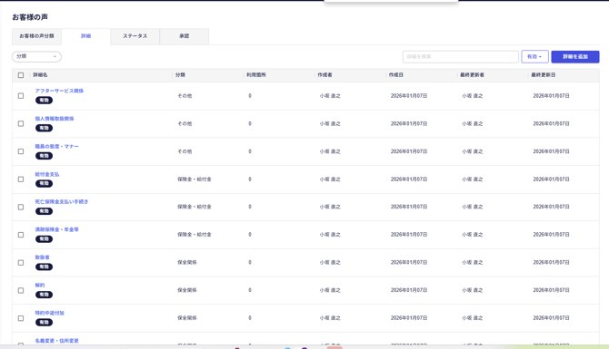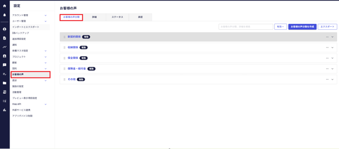 お客様の声については、「分類」ごとに、「詳細」(具体的なお客様の声のご意見の内容)を設定することが可能です。