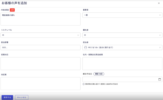 想定解決日数を設定いただきますと、お客様の声を作成する際の「解決予定日」欄に想定の日数が表示され、解決の予定日の入力目安が確認可能です。