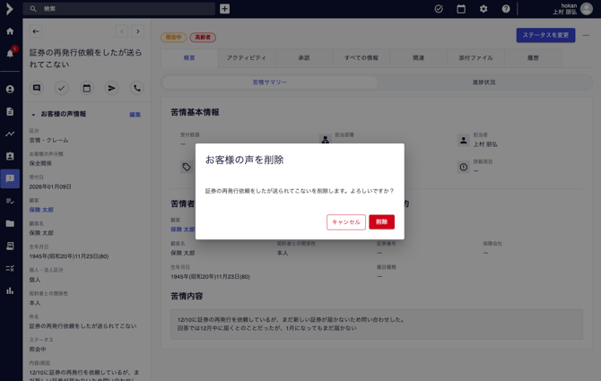 お客様の声を削除する 誤って作成したお客様の声案件を削除することができます。 <手順> 該当するお客様の声の詳細画面を開きます。 画面右上にある「・・・」から「削除」をクリックします [削除]をクリックします。 💡参考 お客様の声一覧画面から削除することもできます。 該当のお客様の声データをチェックし、[処理]から[一括削除]をクリックします。