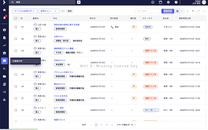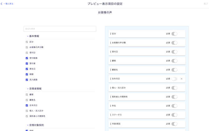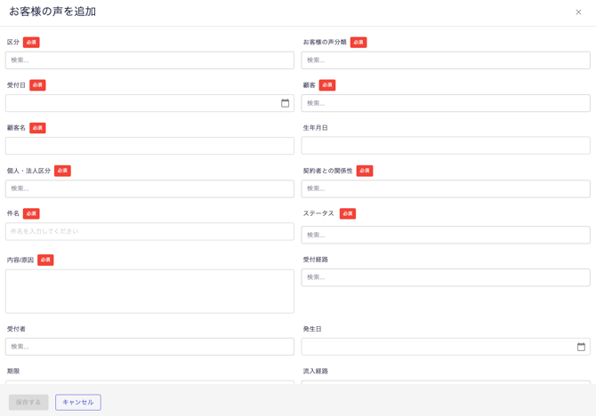 お客様の声を新規作成する お客様の声として管理したい案件の新規作成を行います。 <手順> [お客様の声]をクリックします。 [新規作成]をクリックします。 必要事項を入力し、[保存]をクリックします。 💡参考 編集する項目は[プレビュー表示項目]の設定から変更することができます。 項目は[追加項目設定]から追加することができます。 お客様の声に関する設定は以下からご参照ください。 お客様の声の詳細をカスタマイズする お客様の声の分類をカスタマイズする お客様の声のステータスをカスタマイズする
