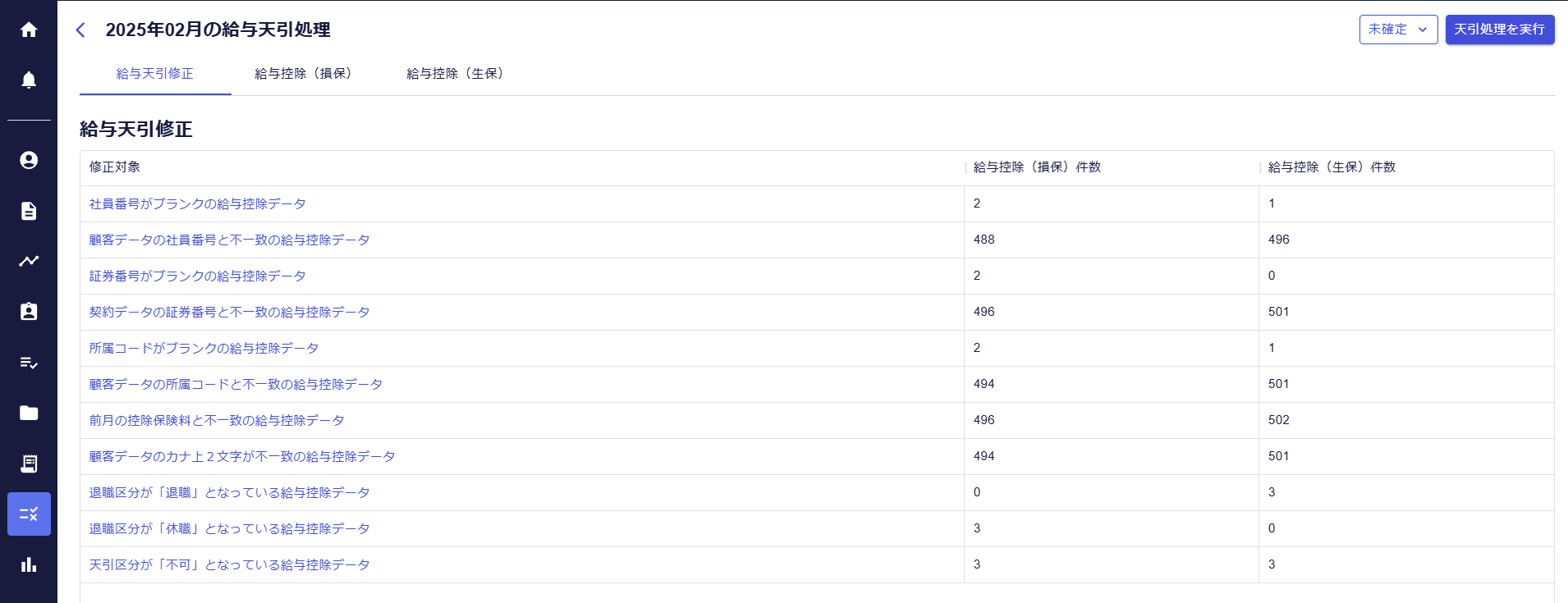 - 控除データと顧客、契約データを比較したエラーチェック結果が表示されます