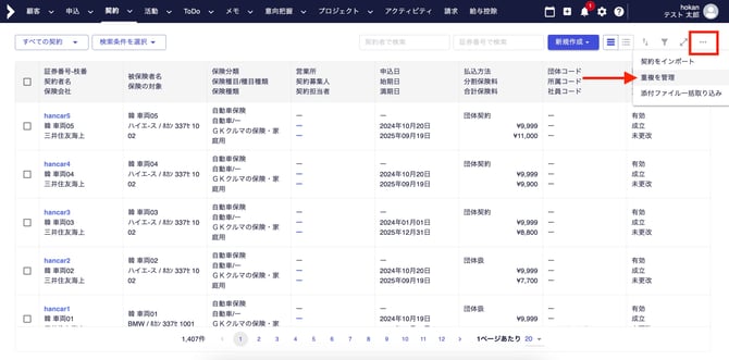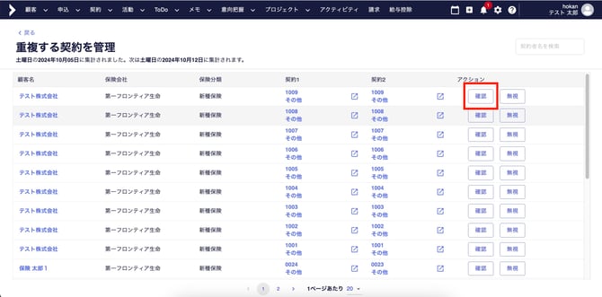 - 重複可能性のある契約が表示され、詳細確認したい契約の右側の「確認」をクリックします。