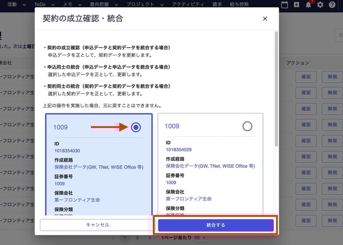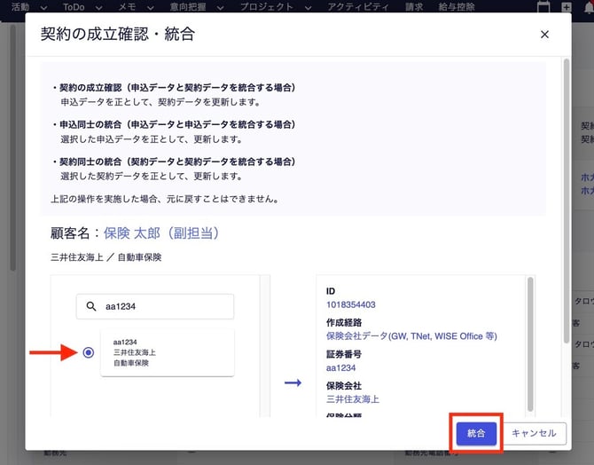 - 統合したい契約データ(左側)を証券番号で検索し、ラジオボタンをクリックして選択します。
