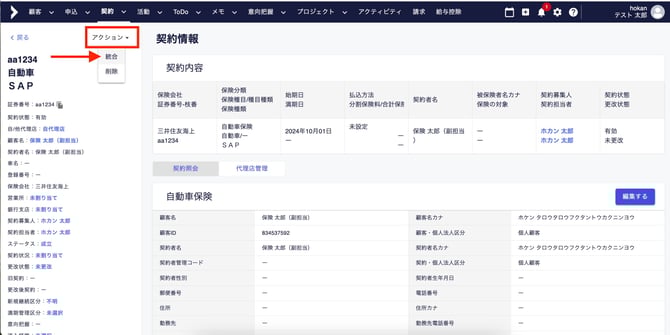 - 契約詳細画面で、左上の「アクション」をクリックし、「統合」を選択します。
