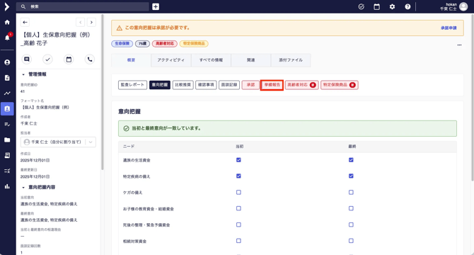 - 挙績報告タブでは、意向把握時に提案した保険商品一覧表を確認することができます。