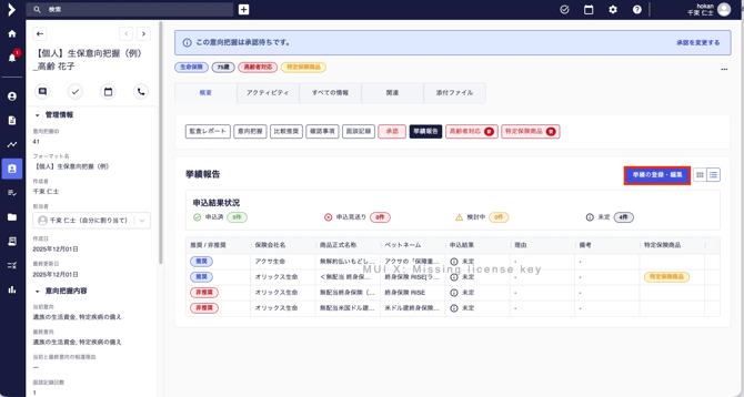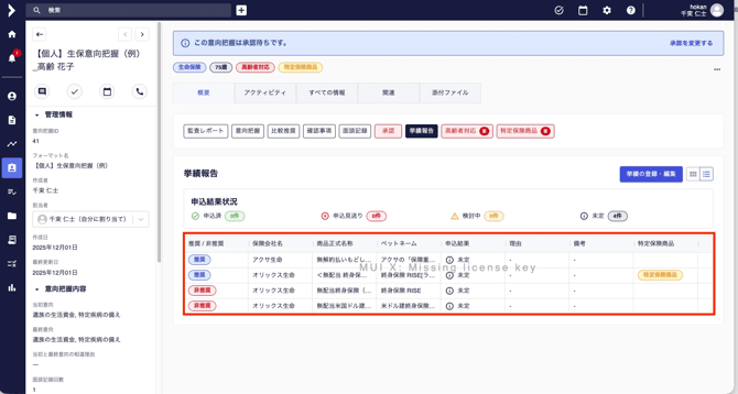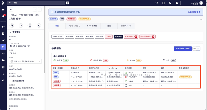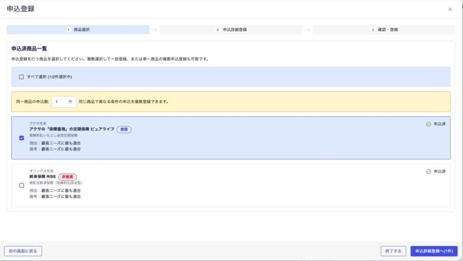 意向把握の詳細画面に戻ります。入力した申込結果・申込理由の内容が、保険商品一覧表に反映されていることを確認できます。