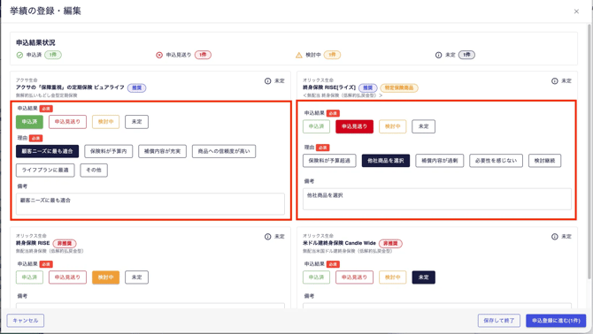 お客様に提案後、申込に至った商品について、意向把握画面から申込記録を登録できます。また、提案商品に対してお客様が申込した/しなかった理由を記録することができます。