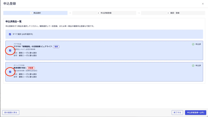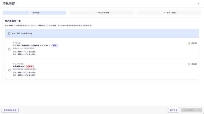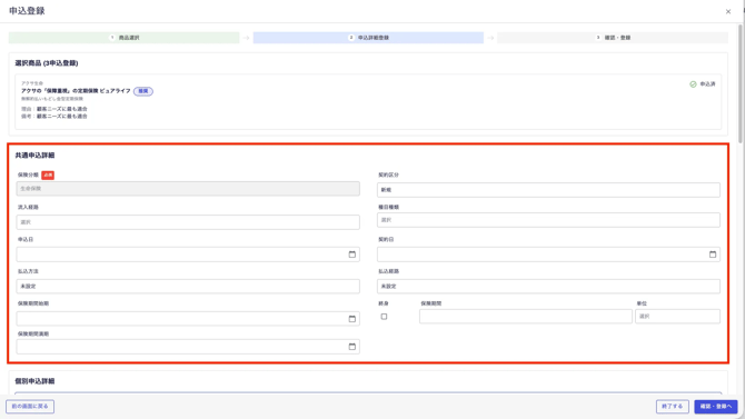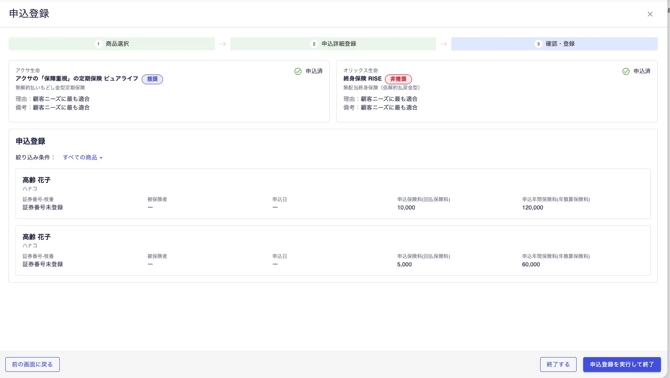 - 確認画面では、申込登録を行う保険商品および入力内容が一覧で表示されます。