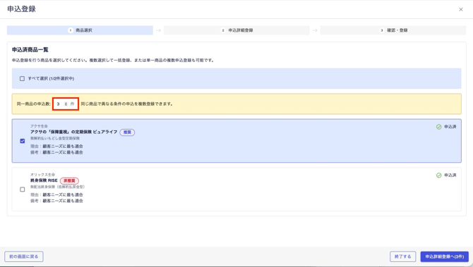 - 同一商品で条件の異なる申込を複数登録する場合は、「同一の申込数」と表示された黄色のバーから商品数を選択します。