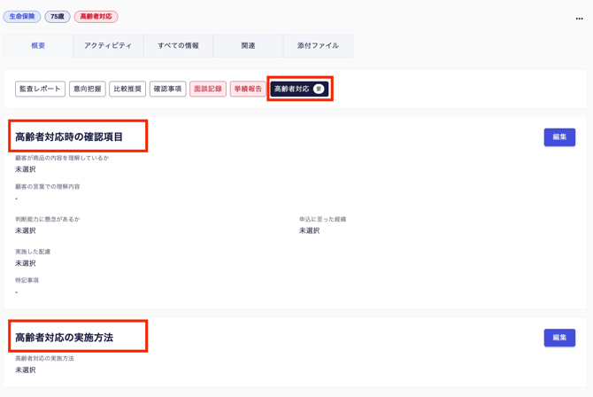 契約者がhokanで設定されている「高齢者年齢」以上の場合、自動で「高齢者対応タブ」が表示されます。