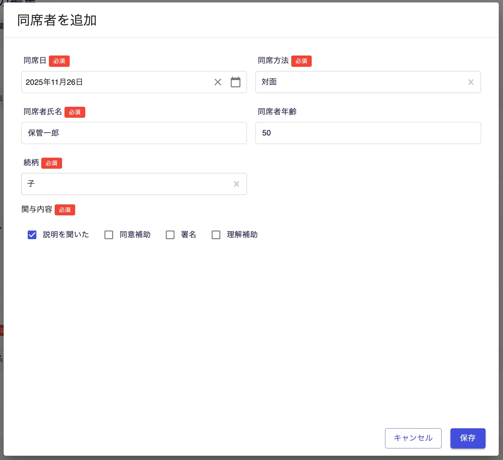 高齢者対応時の確認項目と、高齢者対応の実施方法を記録することが可能です。