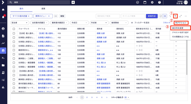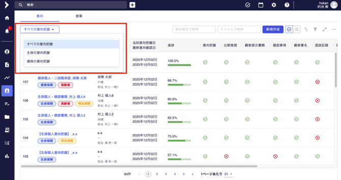 - 画面左上にて対象の意向把握「すべての意向把握」「生保の意向把握」「損保の意向把握」を選択が可能です。