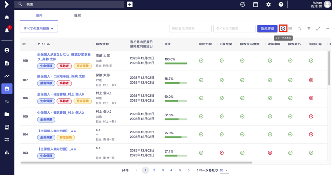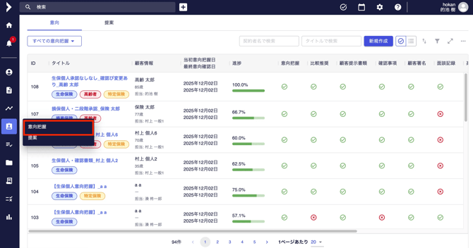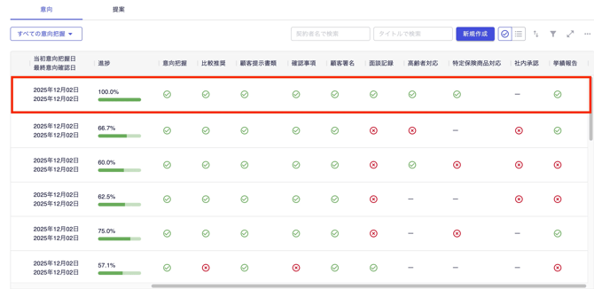 意向把握一覧画面で意向把握の進捗状況と各項目の実施有無を確認することが可能です。また、意向把握時のニード・設問・提案商品なども提案タブで確認することが可能です。