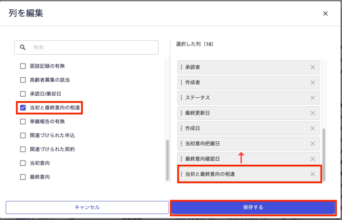 - 表示列の追加や表示列の順番を変更し、保存します。一覧画面に必要な項目を表示することができます。