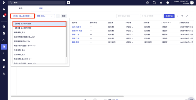 - 右側メニュー「意向把握提案」をクリック、もしくは意向把握画面で「提案」をクリックします。