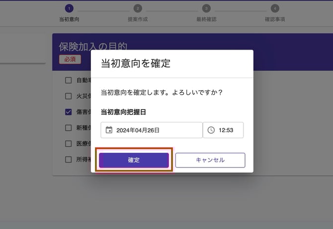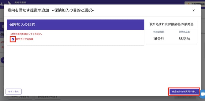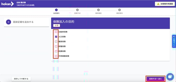 - お客様のご意向に沿った「保険加入の目的」を選択し、「提案作成へ進む」ボタンをクリックします。
