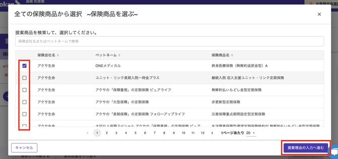 - 提案したい商品を検索・選択し、「提案理由の入力へ進む」ボタンをクリックします。