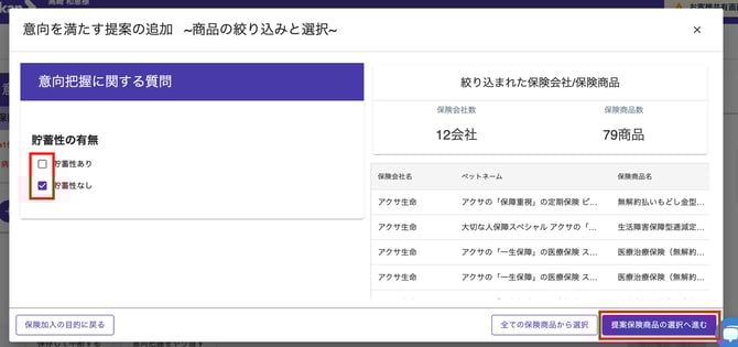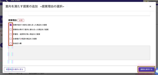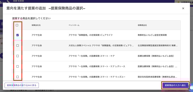 - 該当する理由を選択し、「提案保険商品の選択へ進む」ボタンをクリックします。