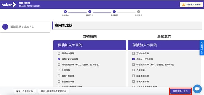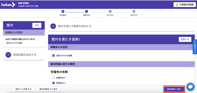- お客様の意向に沿った提案がなされた場合、画面右下にある「最終確認へ進む」ボタンをクリックします。