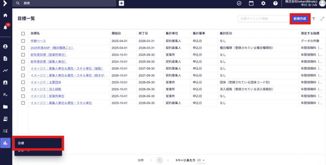 - 「目標一覧」の画面が表示され、右上の「新規作成」のタブをクリックします。