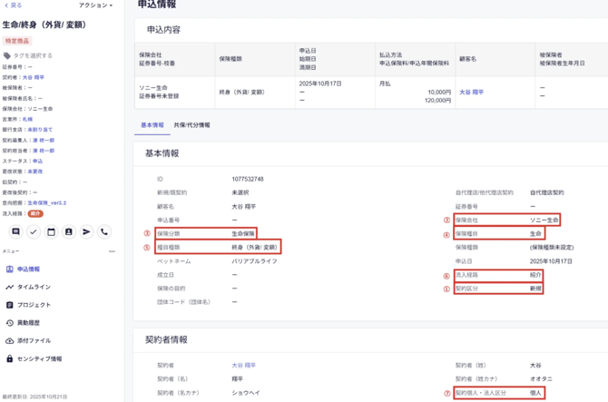 顧客毎に申込情報を確認する項目名 備考 ①契約区分