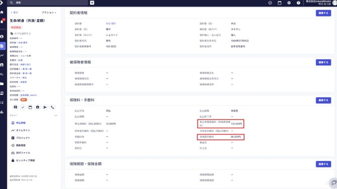 測定する指標(申込管理 ⇒ 申込情報 ⇒ 保険料・手数料に記載あり)