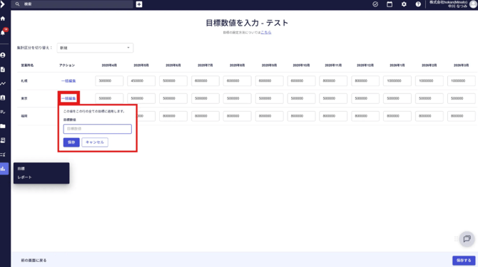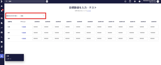 - 各月・各営業所ごとに目標数値を入力します。(月ごとに任意の数値が入力可能)