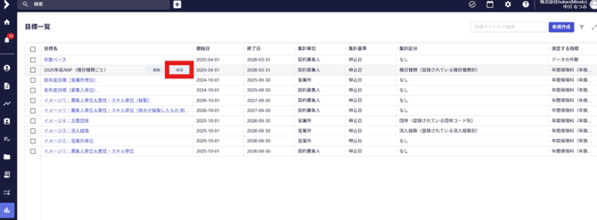 前年度目標の対象となる「目標名」にカーソルを合わせると「編集」「複製」の2つのタブが表示されるため、「複製」をクリック