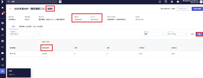 - 複製された目標は、開始年度が自動的に翌年のものとなり、「前年度実績」に数値が反映され現在の進捗との対前年比が確認できます。なお、画面右側にある「進捗」「表」のタブのうち、「表」のタブでのみ、前年実績比較が参照可能です。