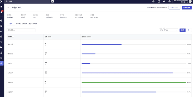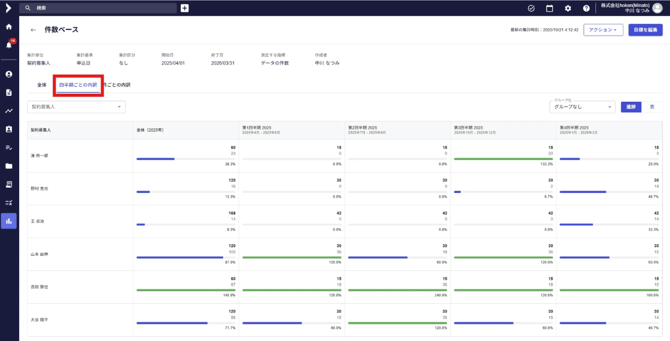 - 左上の「全体」・「四半期ごとの内訳」・「月ごとの内訳」をクリックすることにより、 それぞれの内訳で進捗が表示されます。