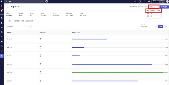 - 抽出したい任意の項目が表示されている画面で、右上の「アクション」のタブをクリックし、 「表データをエクスポート」を選択すると、Excelデータにてエクスポートが可能です。