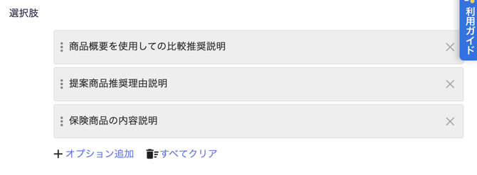 - チェックボックス/セレクター/マルチセレクター/ラジオボタンの選択肢のオプションを削除した場合、該当オプションに今まで登録されていたデータが削除され復元することはできません。
