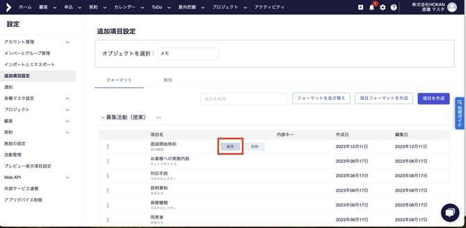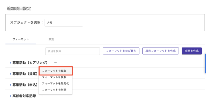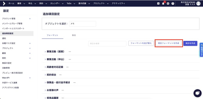 - フォーマットを新設する場合、「項目フォーマットを作成」ボタンをクリックします。