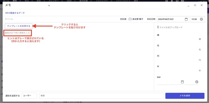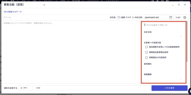 利用シーンに応じてメモ項目のカスタマイズ(追加項目設定)を行い、メモフォーマットを設定します。履歴登録における入力負荷軽減や業務標準化を狙うことができます。