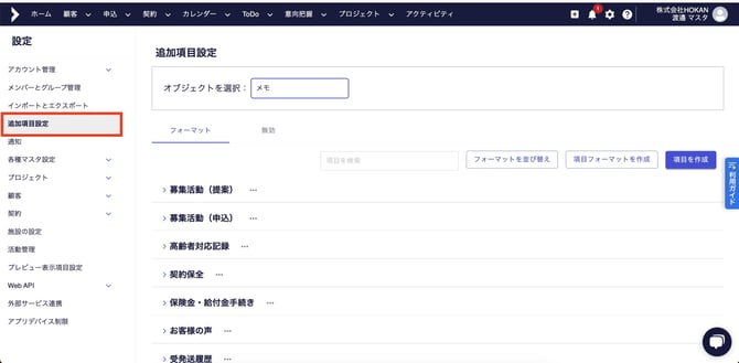 - 設定画面で、左側の「追加項目設定」タブをクリックします。