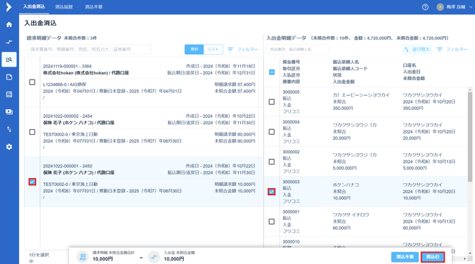 - 画面左側「入出金明細データ」から、3.で選択した請求明細データ対応する入出金明細を選択します