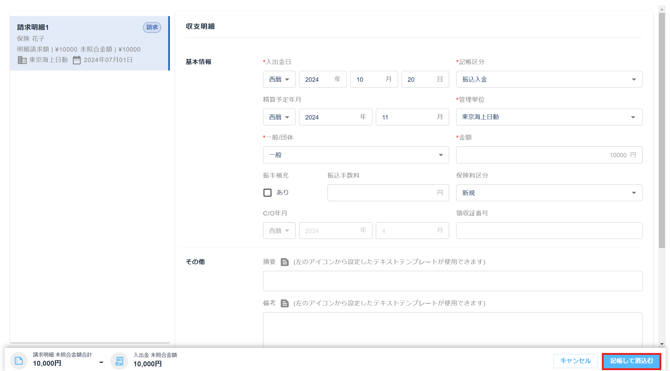 - 必要事項を追記・編集して「記帳して消込む」をクリックします